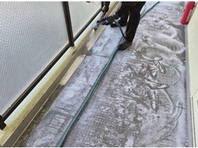 7.洗剤を高圧洗浄35km/cm で洗浄します。市販のスプレータイプのものでは奥の汚れまでは取れません。